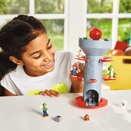 This Super Mario Shaky Tower balancing game is suitable for multiplayer family games from 4 years old, with an easy-to-assemble Shaky Tower, 7 unique Super Mario action figures including Mario, Luigi, Yoshi, Toad, Yellow Toad, Goomba, and Boo, and game dice. Gameplay is simple, players take turns rolling the dice to determine the number of characters placed or taken off the tower. Be careful not to shake the tower or Mario and his friends will fall! But it doesn't last long for each game, and it's a high-quality game that is suitable for all ages and is suitable for the whole family to enjoy. It is worth reminding that the parts of this game are small and not suitable for children under 3 years old, so as not to accidentally swallow it.